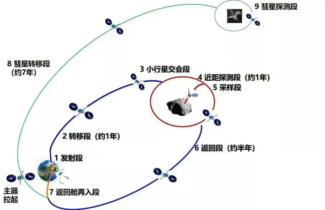 很多人可能还不清楚,天问二号这次的任务有多“硬核”。它的整个任务周期长达10年,目标堪称“太空连环任务”: