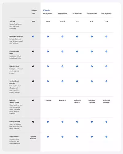 下图为苹果在美国的iCloud+ 套餐对比表。